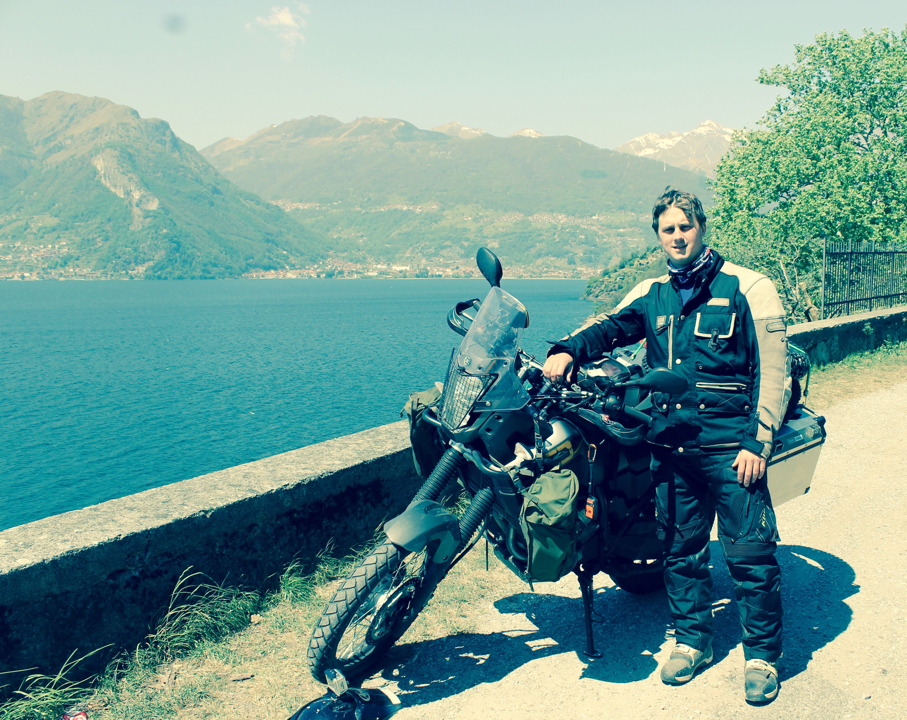 The plan was to pootle around Lake Como this morning, visit the MotoGuzzi factory on the way around and then make my way over to Trieste near the Slovenia border via Lake Garda. Well, that was the plan, but it changed at breakfast when I saw a Yamaha Tenere parked next to my bike and then met the rider, Rob. Rob is in the second week of a 2+ year round the world trip – Europe, east into The Stans, Russia, Mongolia, across to Canada, then south to Argentina. He tried it two years ago, but had to be flown home when he broke his leg riding off road in Mongolia. Brave lad, and only 25 years old. Rob has a blog http://www.memybikeandi.co.uk/ and a more active Facebook page https://www.facebook.com/pages/Me-my-bike-and-I/869721646402771?fref=ts check him out.