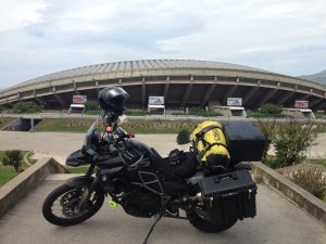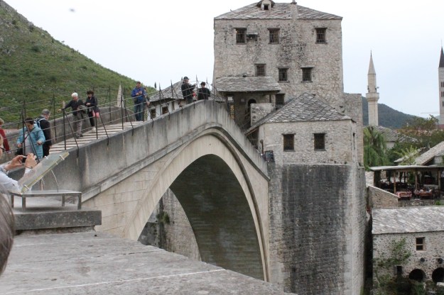 Anyway, I made it to Mostar. Not sure it was worth it though; the town feels like a tourist trap run by men who look like Bond henchmen – all shaved heads and I’ll fitting sports wear. I was charged €5 to park my bike (bear in mind my hotel the night before was only €23) and the guy admitted that it really wasn’t for parking, but for security. The road to the bridge is lined with stalls selling ethnic junk, the type you find in markets all over the developing world. the cafes selling over priced crap food.