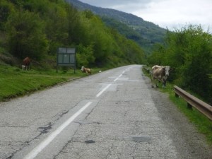 The road to the border was, erm, interesting. Lovely scenery, but rubbish Tarmac, and at the start of the Tara canyon there were road crews everywhere making repairs. There were opportunities (not taken) to ride off road, and I came across something I didn’t think I’d see on the road until I got to India – cows!