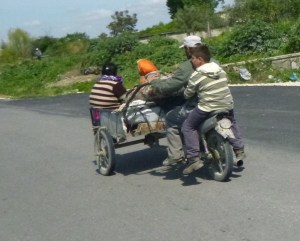 You can see all sorts on the road: knackered mopeds, bangers, there’s loads of VW type 25 camper vans, donkeys… there’s also brand new pimped up Range Rovers with blacked out windows (don’t want to think about who’s driving those). Drivers seem polite, but just decide to do random stuff like stoping and getting out in the middle of the road, joining and leaving roundabouts feels like pot luck. As for lane discipline…. Forget it. This is meant to be three lanes – but I counted 7 rows of cars battling for space. Not much room for motorbikes to filter.