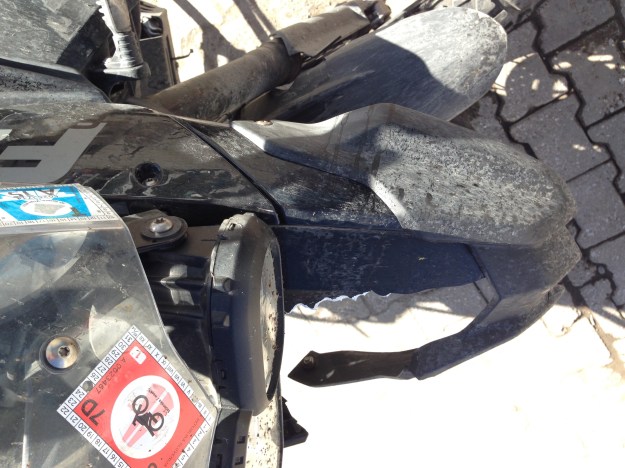 The bike came off worse –  front / side on collision with a car – we hit at right angles – my wheel hit the front of his van, my helmet smashed his windscreen and my shoulder has made another pot hole in the road. The wheel is probably ruined, brake discs definately, forks bent, fork clamp snapped in two, assorted bits of plastics scattered around the street. There’s no way I can tell if the frame is bent (I’d be surprised if it wasn’t). No idea if the radiators are broken.