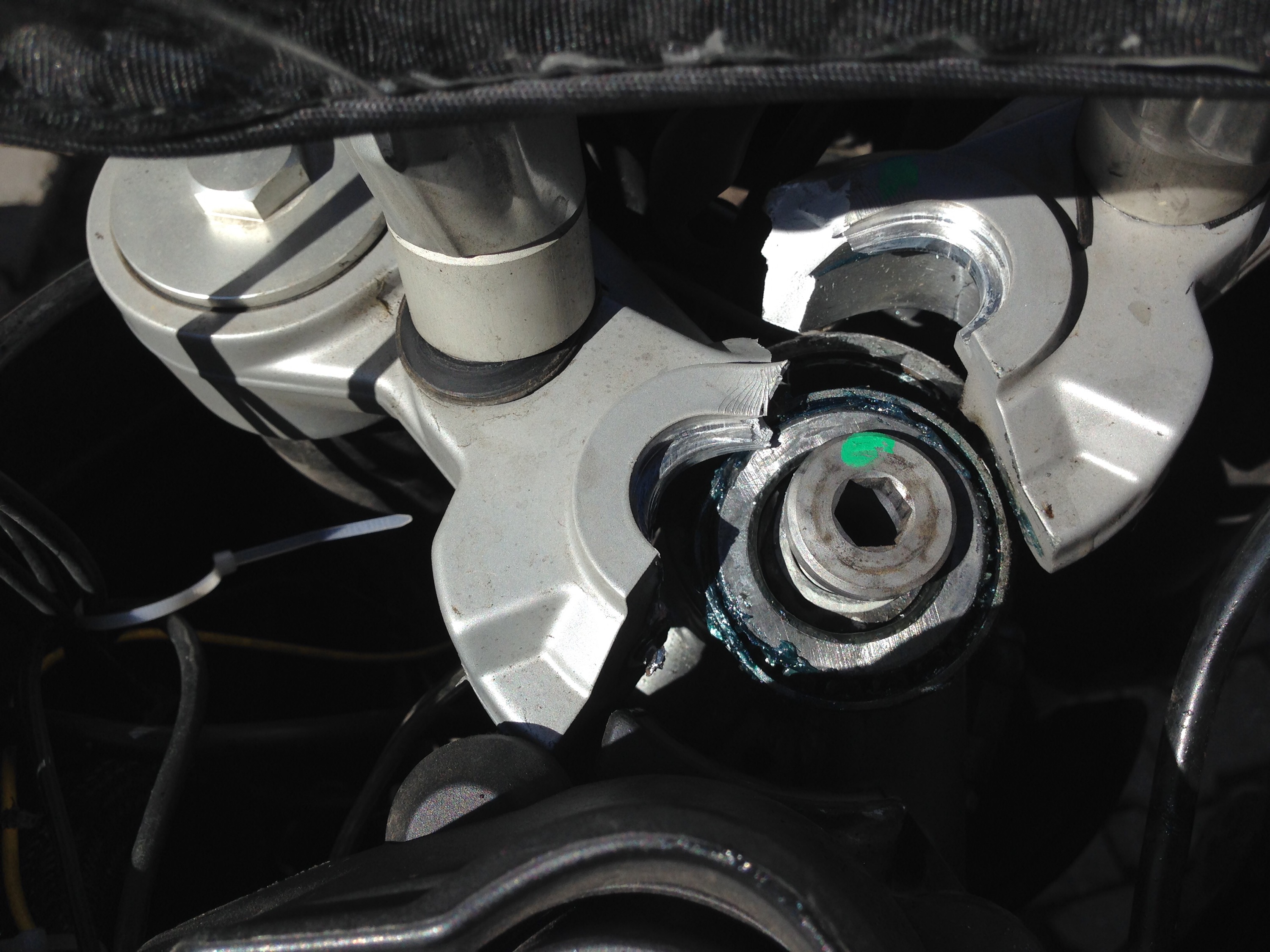The bike came off worse –  front / side on collision with a car – we hit at right angles – my wheel hit the front of his van, my helmet smashed his windscreen and my shoulder has made another pot hole in the road. The wheel is probably ruined, brake discs definately, forks bent, fork clamp snapped in two, assorted bits of plastics scattered around the street. There’s no way I can tell if the frame is bent (I’d be surprised if it wasn’t). No idea if the radiators are broken.