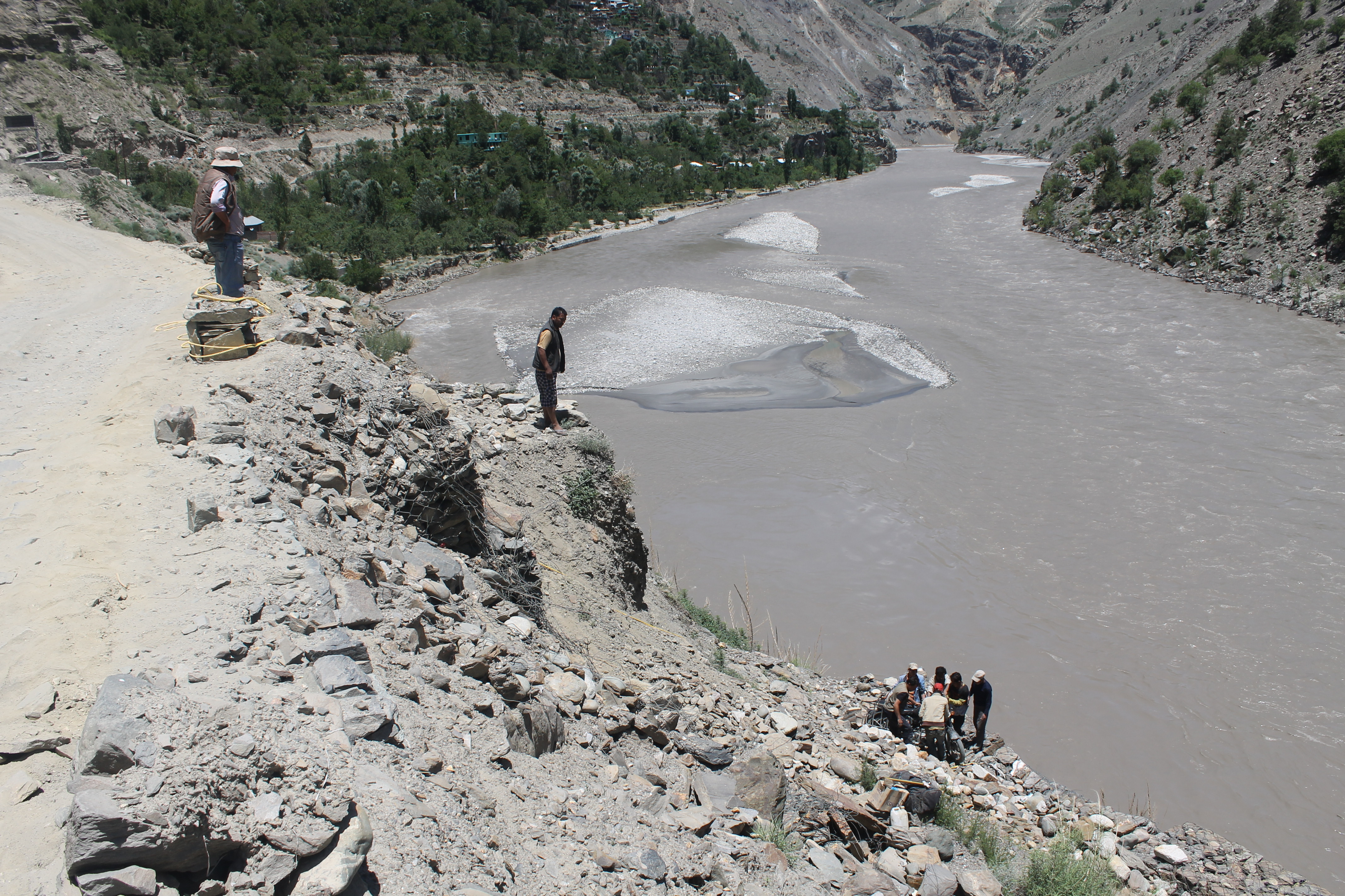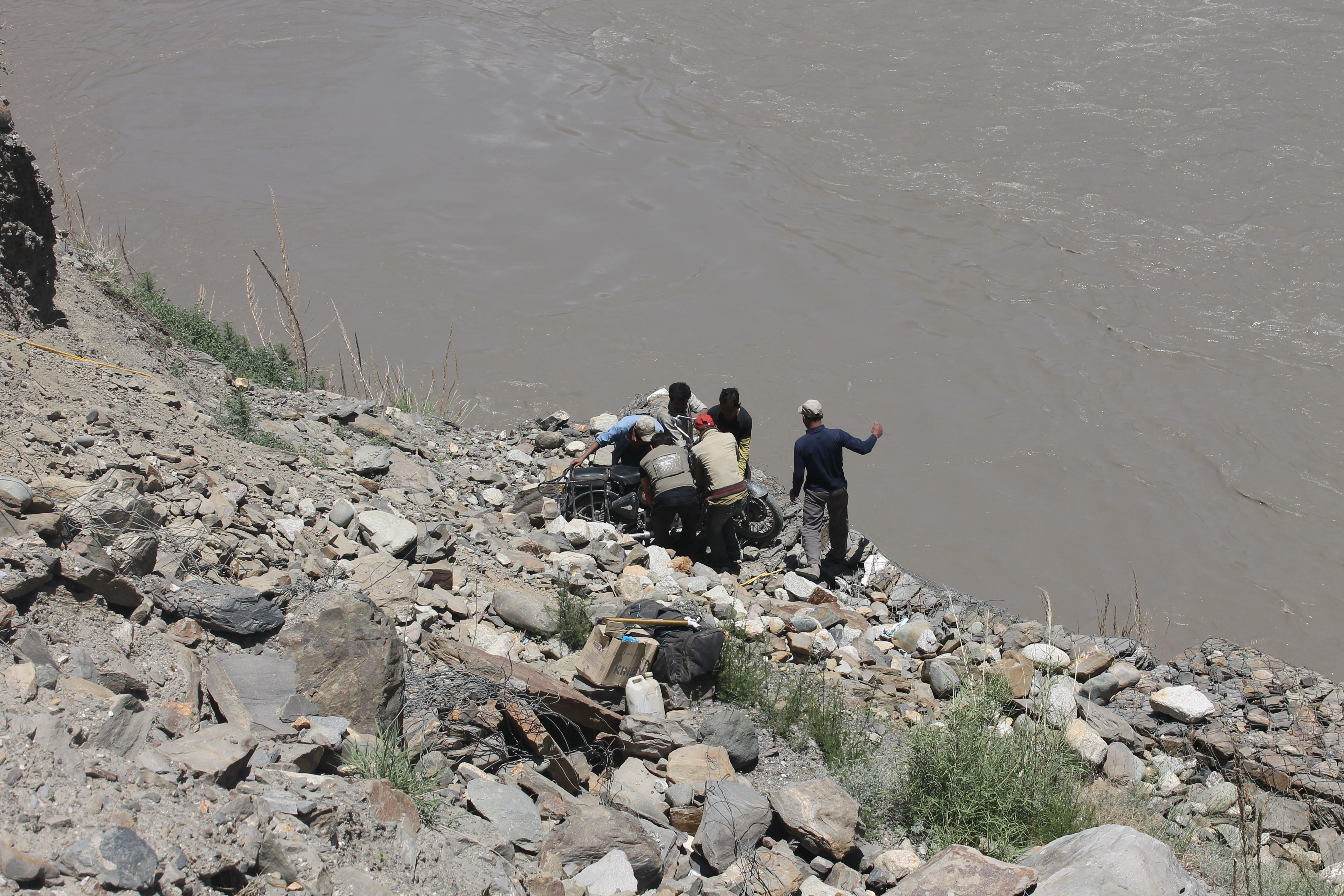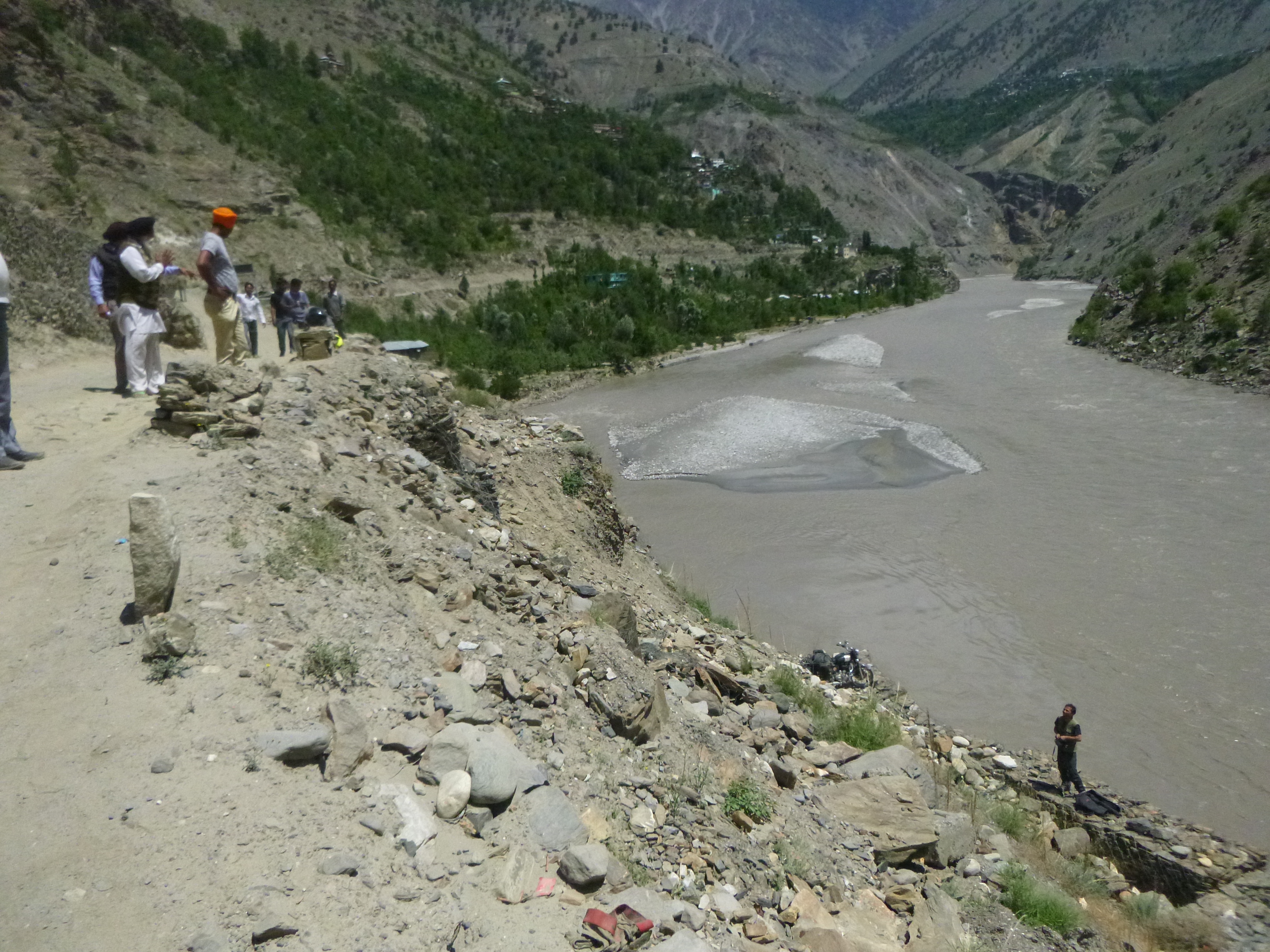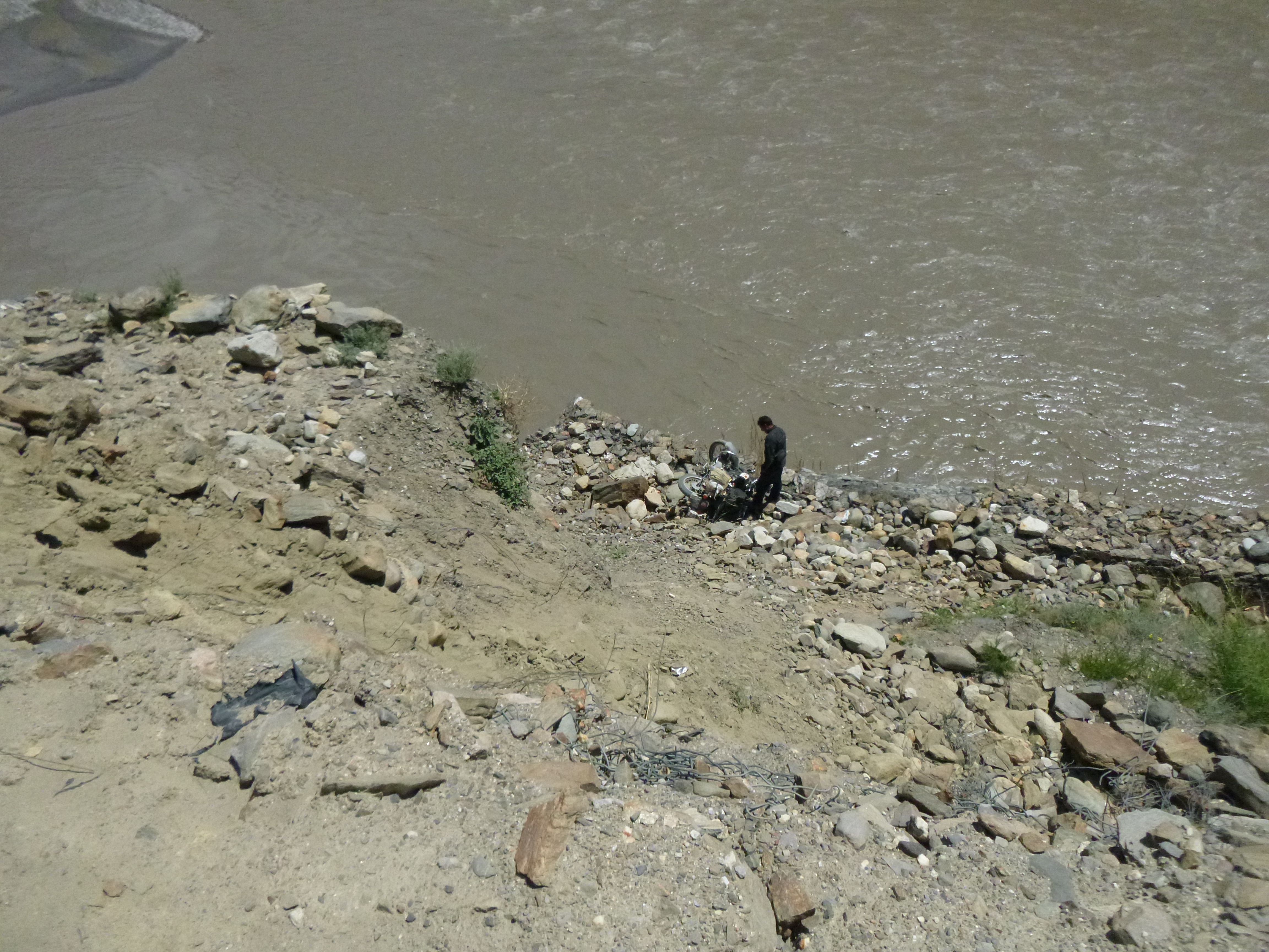 We rode for a couple of hours to the town of Spello(w) and stopped for a cup of chai. Then set off again, but in less than 500 meters disaster struck. Moti hit a fairly innocuous looking rock which sent his bike out of control; the front end went up, the back end went sideways, Moti had the good sense to fall off to the right, and the bike went down on its side, slid for a bit, rolled over, pirouetted on the front wheel and popped off over the edge of the cliff and came to a less than gentle rest 20 feet below – but crucially 10 feet above the river.
