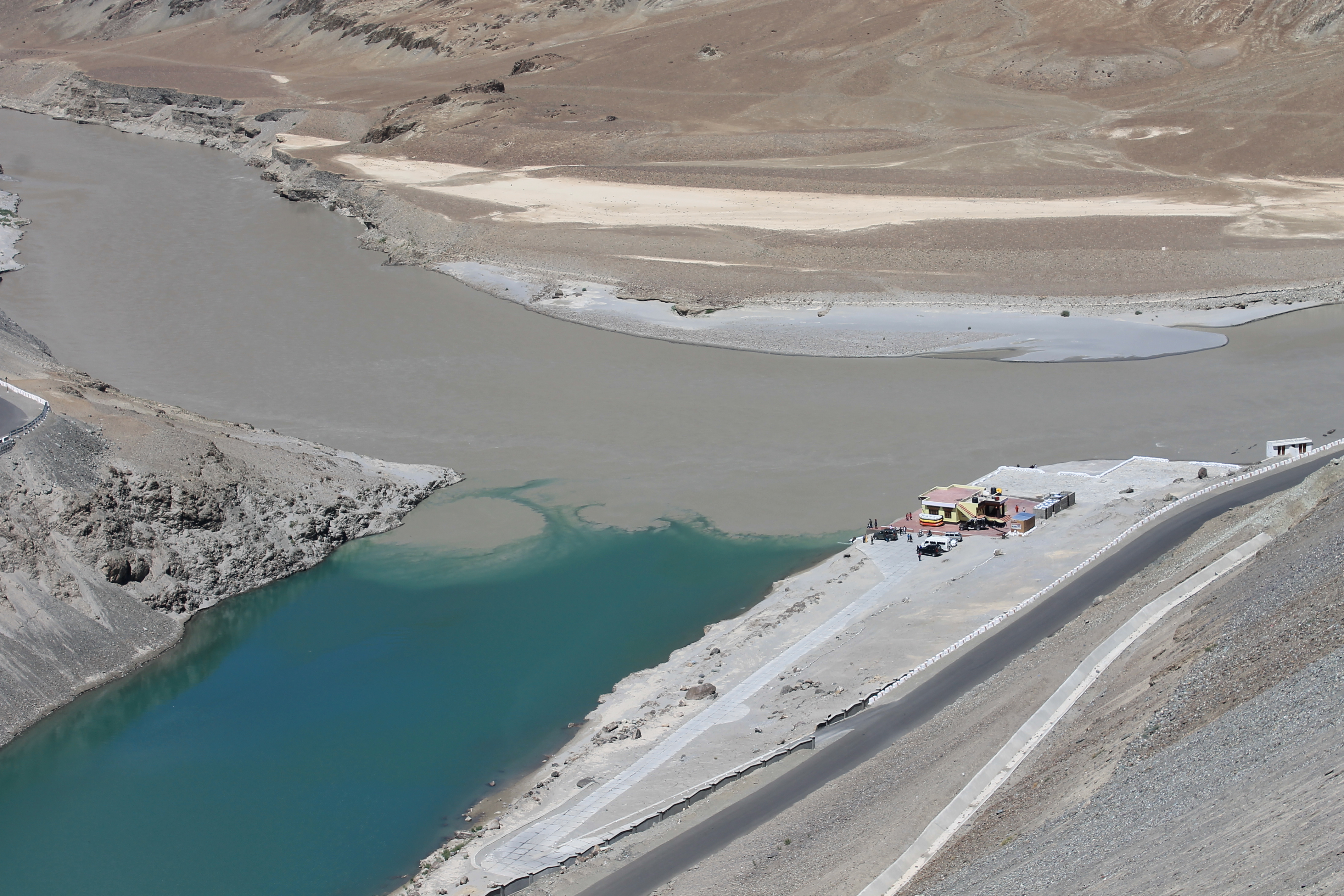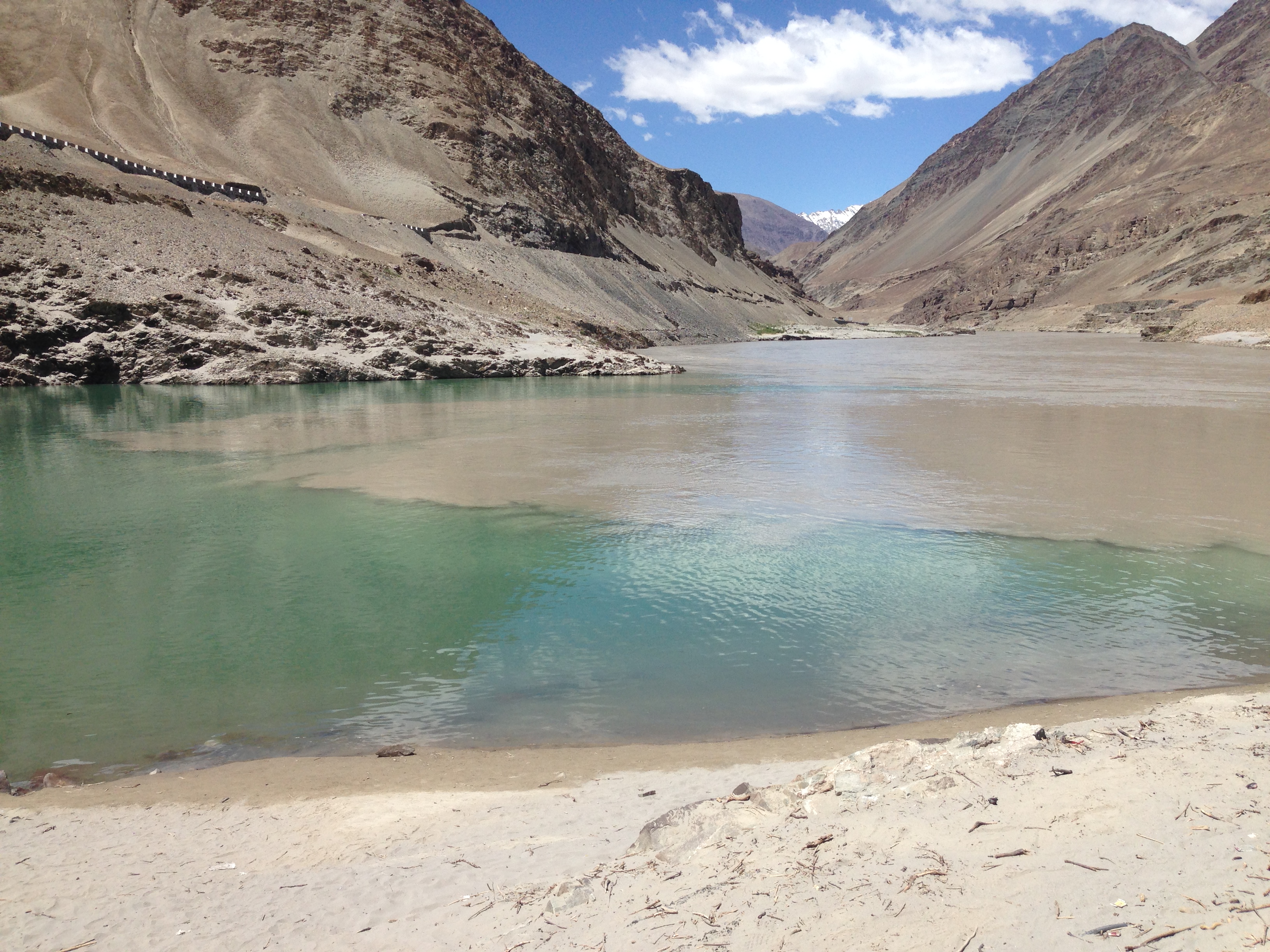 Further along the highway is another site I’d read about in the Adventure Motorcycle Handbook – “Around 30km from Leh is a viewpoint where the clear turquoise green Indus mixes with the sediment-heavy Zanskar river coming up from the South (or so it was or us)” Well, here you go. Looks far more impressive from the top of the hill than it does from the river side.