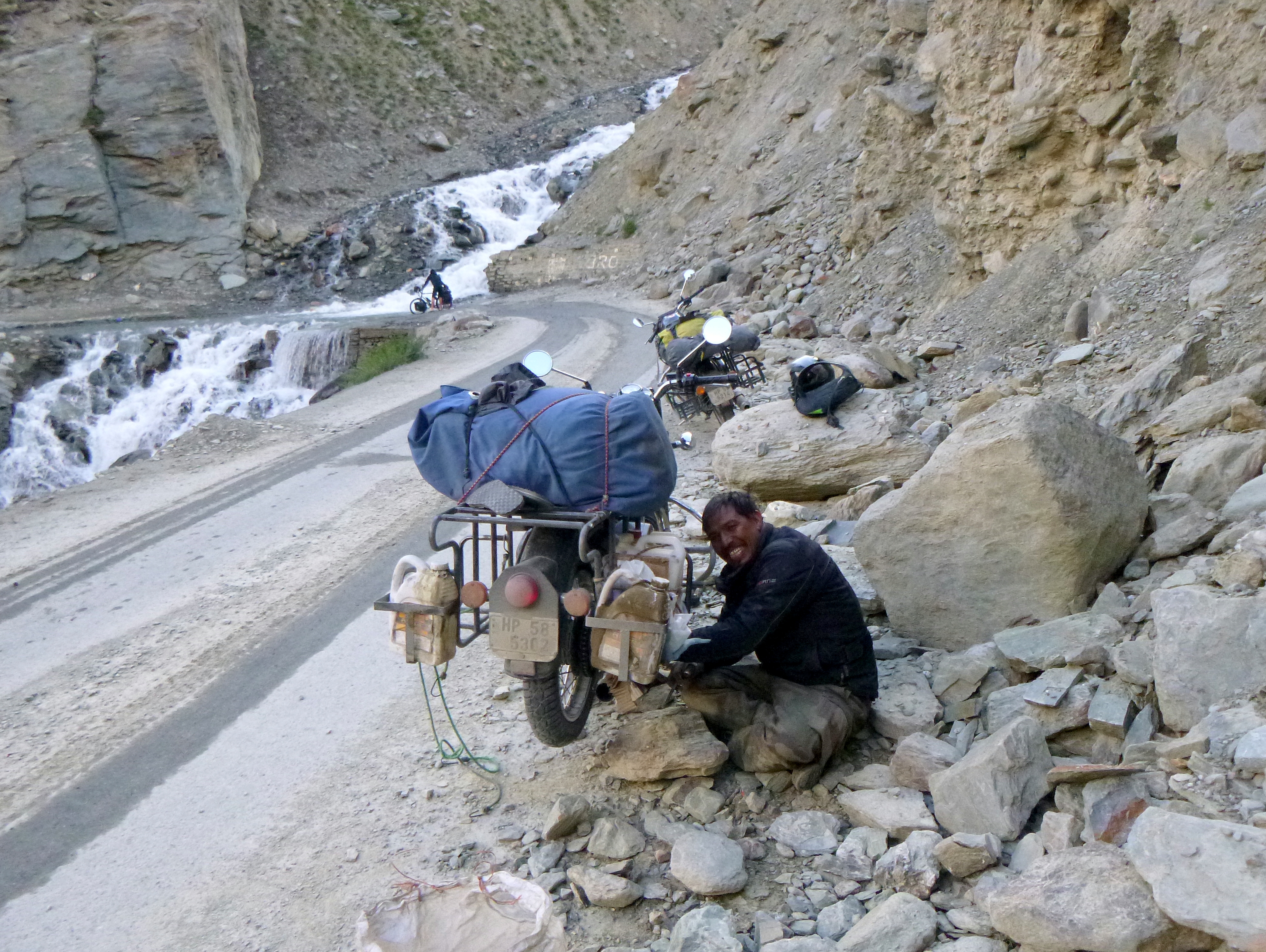 Just before we got to Jispa, Moti got another puncture – his fourth of the trip. So, spanners out…